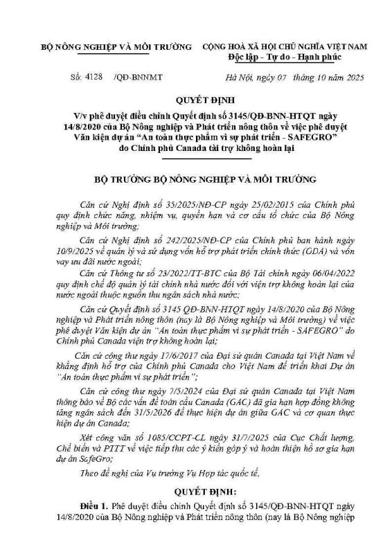 Quyết Định – V/v phê duyệt điều chỉnh Quyết định số 3145/QĐ-BNN-HTQT ngày 14/8/2020 của Bộ Nông nghiệp và Phát triển nông thôn về việc phê duyệt Văn kiện dự án “An toàn thực phẩm vì sự phát triển – SAFEGRO” do Chính phủ Canada tài trợ không hoàn lại