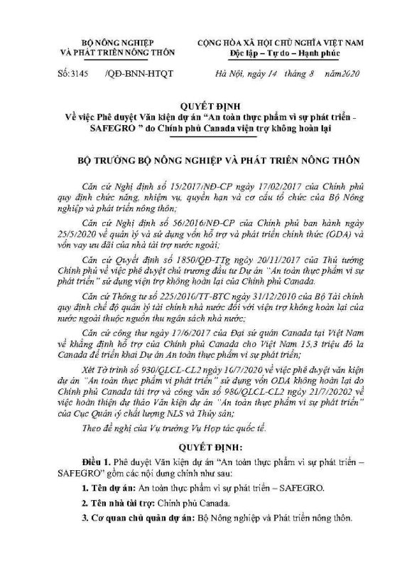 QUYẾT ĐỊNH – Về việc Phê duyệt Văn kiện dự án “An toàn thực phẩm vì sự phát triển – SAFEGRO ” do Chính phủ Canada viện trợ không hoàn lại